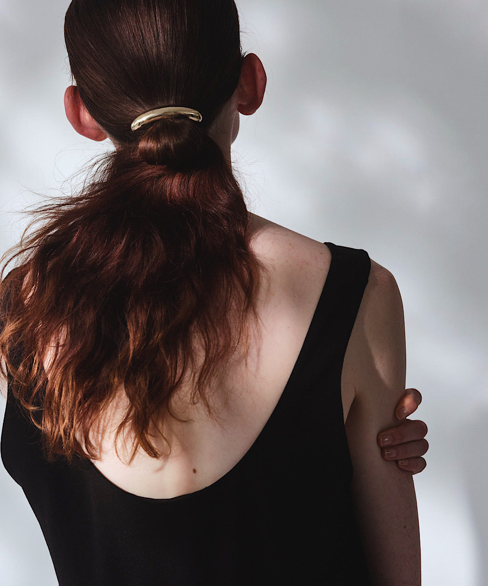 モダンな形でありながら、ユーモラスであたたかな雰囲気のヘアゴムは、ジュエリーの延⻑として楽しめます。
